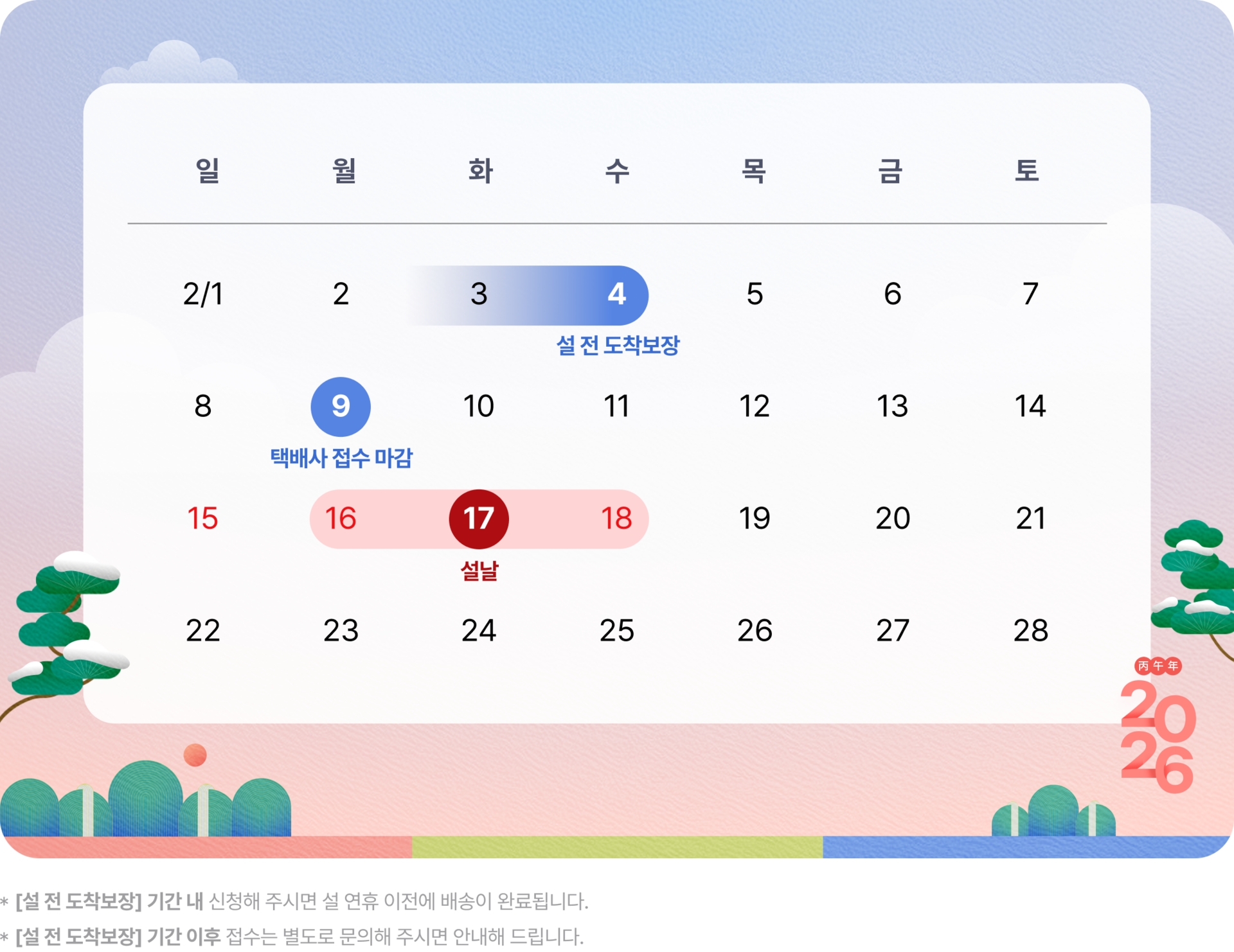 * [설 전 도착보장] 기간 내 신청해 주시면 설 연휴 이전에 배송이 완료됩니다.